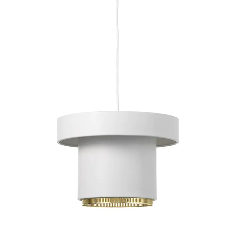 Pendant Light A201 was designed by Alvar Aalto in 1952 for the library of Saynatsalo Town Hall in central Finland. Composed of formed sheet steel, Pendant Light A201 possesses a sculptural presence; its beauty can be appreciated whether switched on or off. The light exiting the lower and upper part of the shade creates a beautiful halo, typical to Aalto who sought to make artificial light as indirect and soft as possible. The A201 is available in standard white with brass details, inspired by the triple variation of the light (A203) hanging above the dining table in the Aaltosâ private Helsinki home.