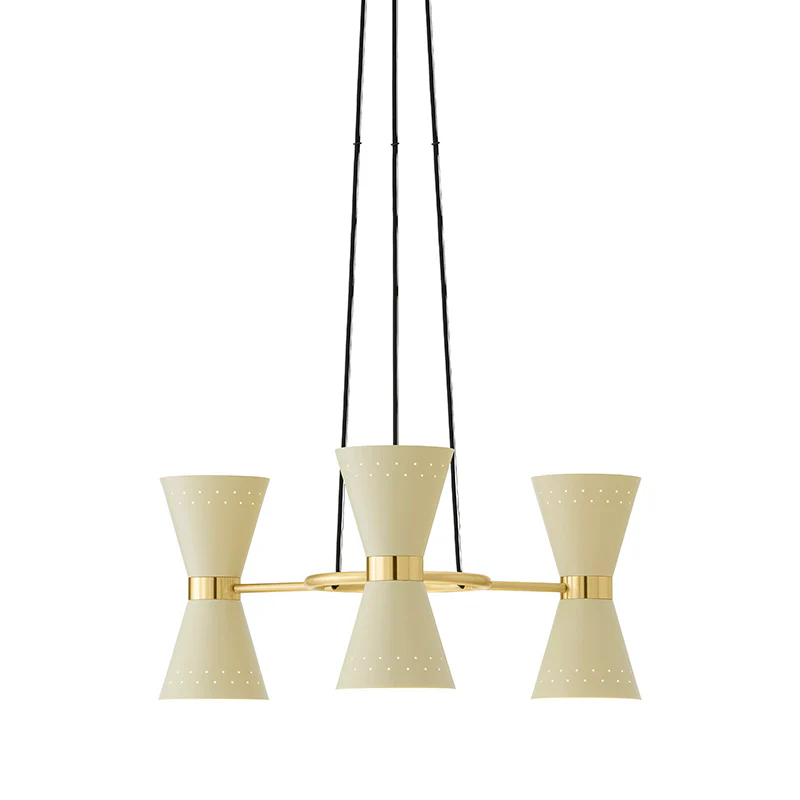 Imagined by the industrious Swedish furniture designer Alf Svensson in the 1950s, Chandelier 3 is one of three lighting designs in the Collector series. Shaped from a central band of solid brass, six conical metal shades direct the light upwards and downwards to illuminate with ambient light. Small perforations in each shade disperse the light outwards, creating intriguing shadows. The sophisticated mid-century design has timeless appeal thanks to its considered combination of graphic beauty and classic elegance. Not only functional, it is also a decorative lighting fixture in any space.
