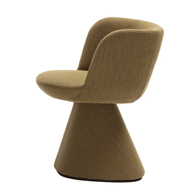 Flair O’ is a small domestic throne, a chair that matches the Allure O’ table perfectly. The two objects establish a dialogue starting from their bases. Both pieces sit atop a truncated pyramid with rounded edges to reconcile the concepts of elegance and charm. The base widens gently on the back side as it nears the floor. It becomes almost unnoticeable and provides great stability without interfering with the harmony of the design. A padded seat provides necessary comfort. Moreover, the accentuated tilt of the backrest and its enveloping shape help people relax without compromising the ideal posture to adopt when interacting with others elegantly around a dining table. Furthermore, the SF60M chair is equipped with a swivel mechanism with an automatic return. The fabric cover embraces Flair O’ like a tailored suit, covering it completely from the seat to the base.