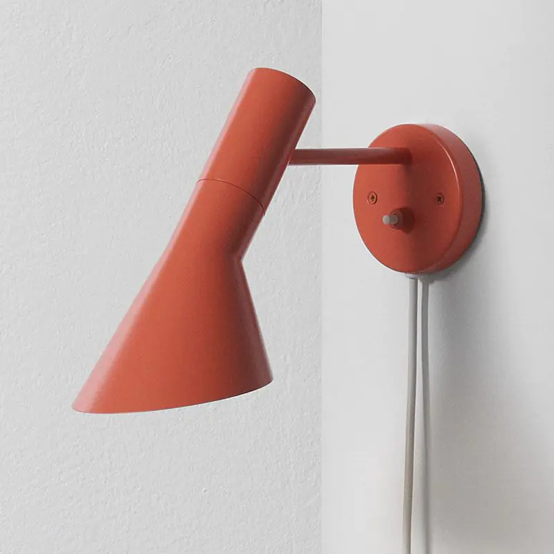 Arne Jacobsen designed this fixture, among many other features, for the SAS Royal Hotel in Copenhagen, in 1957. The wall lamp yields a pleasant downward directed light with its white painted inner shade. Furthermore, the shade can be tilted to adjust light distribution.