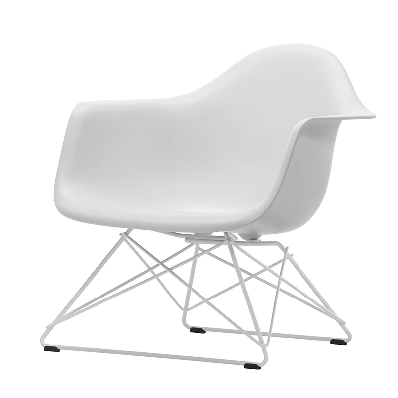 The LAR seems to have been one of Charles and Ray's favourite designs: it can be spotted in numerous vintage photographs of the legendary Eames House in Pacific Palisades - both indoors and out. This also reveals how lightweight the chair is, and how easily it can be moved around. Thanks to its compact dimensions, the Plastic Chair LAR can also be used in smaller interiors, and the wide choice of colours for the shell, upholstery fabric, and base can be coordinated with diverse styles and settings. The steel wire base, which achieves maximum stability with minimum materials, acquired a charming nickname within just a short time on the market as a result of its unusual form: 'Cat's Cradle' - in reference to the children's string game. Due to the organic shape of this classic armchair, the LAR is a striking solo piece, but it can also be paired with many types of sofas to create an appealing contrast. Especially in the version with full upholstery, the LAR offers long-lasting comfort, making this modestly sized armchair an excellent seating option for any living space.