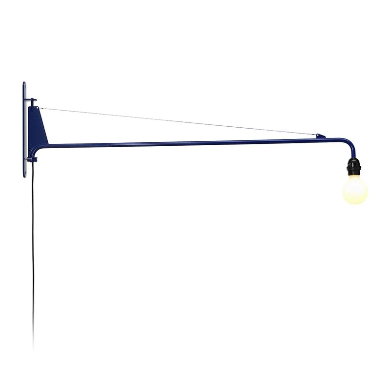 Jean Prouvé created the first version of the Potence wall lamp in the 1940s for his own home in Nancy: a simple light bulb affixed to a long, pivoting steel bar, which is held by a steel wire. This functionalist, puristic design was soon produced in various sizes, with an added handle on larger models to facilitate the swivel movement.